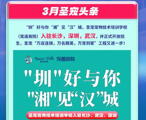 新校區(qū)、新店型、新身份......圣寵3月份都做了哪些大事兒! “圳”好與你“湘”見“漢”城,圣寵寵物技術(shù)培訓(xùn)學(xué)校(寵道商院)入駐長沙,深圳,武漢,并正式開放招生,圣寵“萬店連鎖,萬名精英,萬寵到家”工程又進(jìn)一步。 更多>>